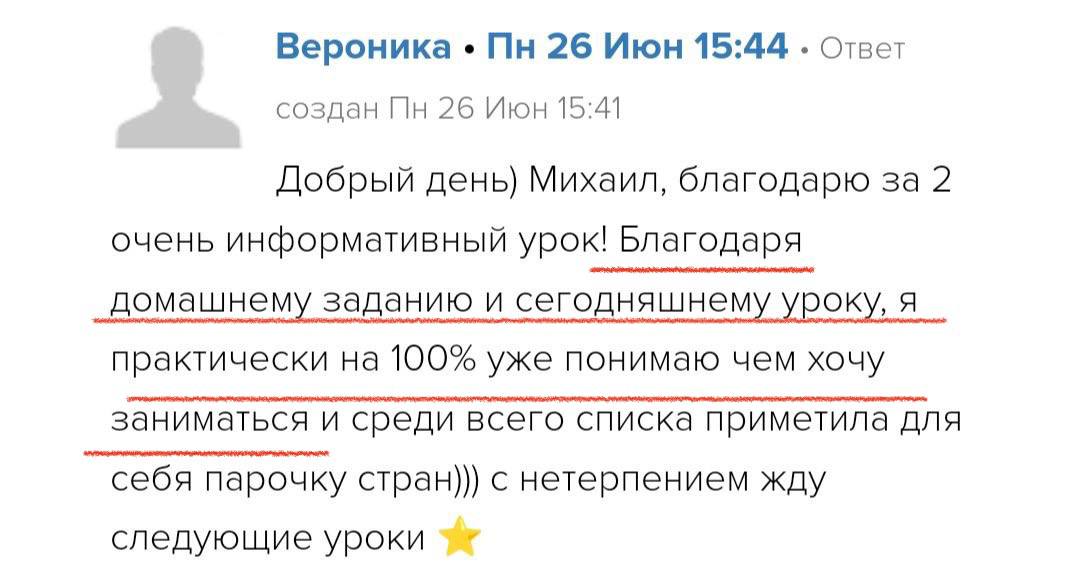 Что сделано: Прошла курс и определилась с желаемой профессией на основе рекомендаций на курсе и личного предпочтения. Начала использовать нейросети, чем ускорила свой рост и навыки. Подбирает путёвки, а два месяца в году в сезон ездит гидом на море и заодно отдыхает. Устроилась с 1-й попытки.
